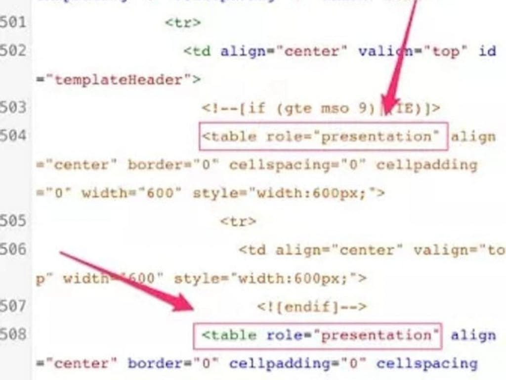 Most HTML emails utilize HTML table tags because they make it easy for users to check their emails in distinct email applications and gadgets. However, table tags were never intended for displaying HTML; they work like most other web design techniques. As a screen reader will normally group table cells as separate lines, screen reader users may experience portions in the content that do not flow together with smoothness. That being the case, you should consider injecting a bit of code in your HTML that prevents screen reader users from attending to the content displayed in tables. You might already have a brief snippet of code named presentation that targets such users. just add the code to the morsel and it will function as an alert to users.